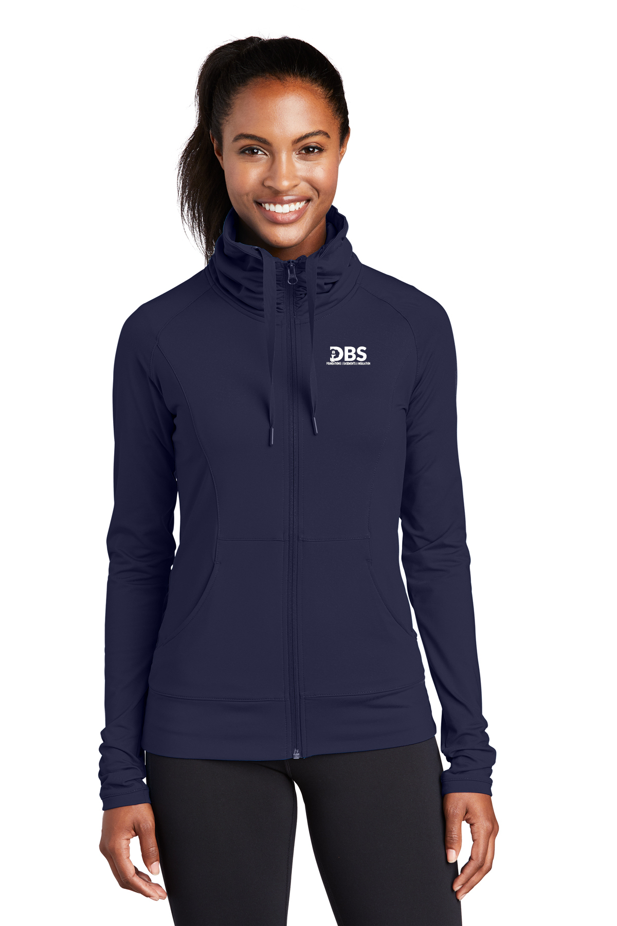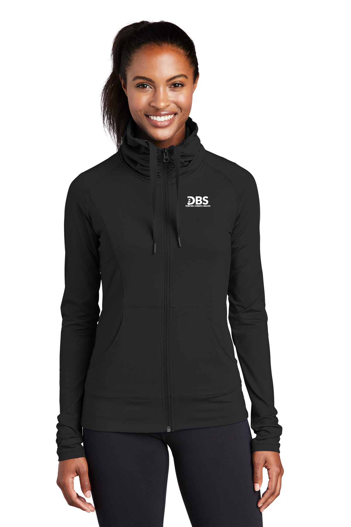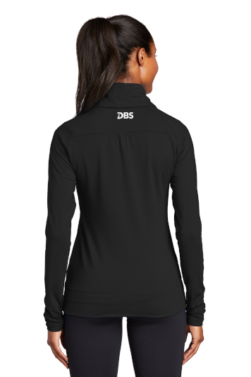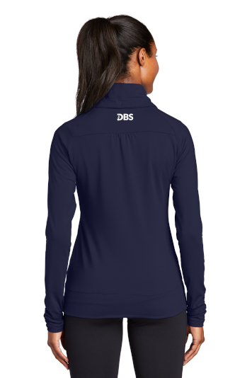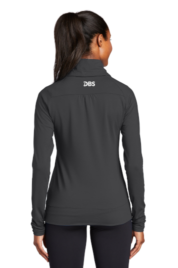 A stretchy, moisture-wicking performance jacket with a soft-brushed backing and unique cowl collar.